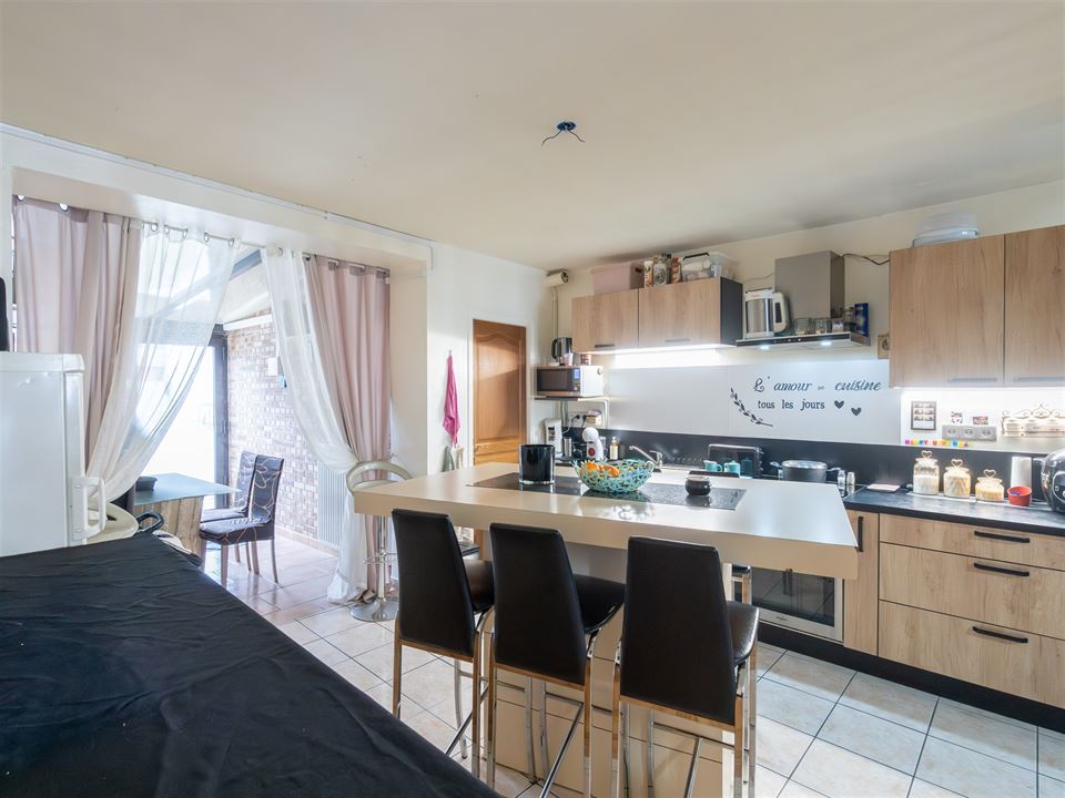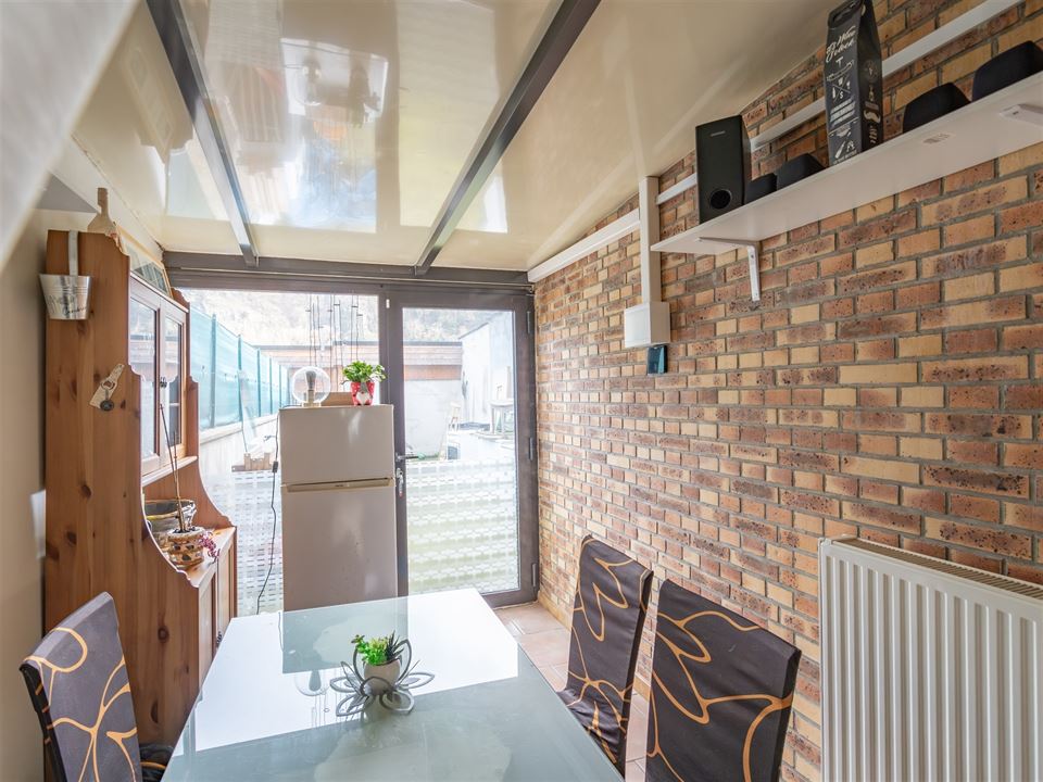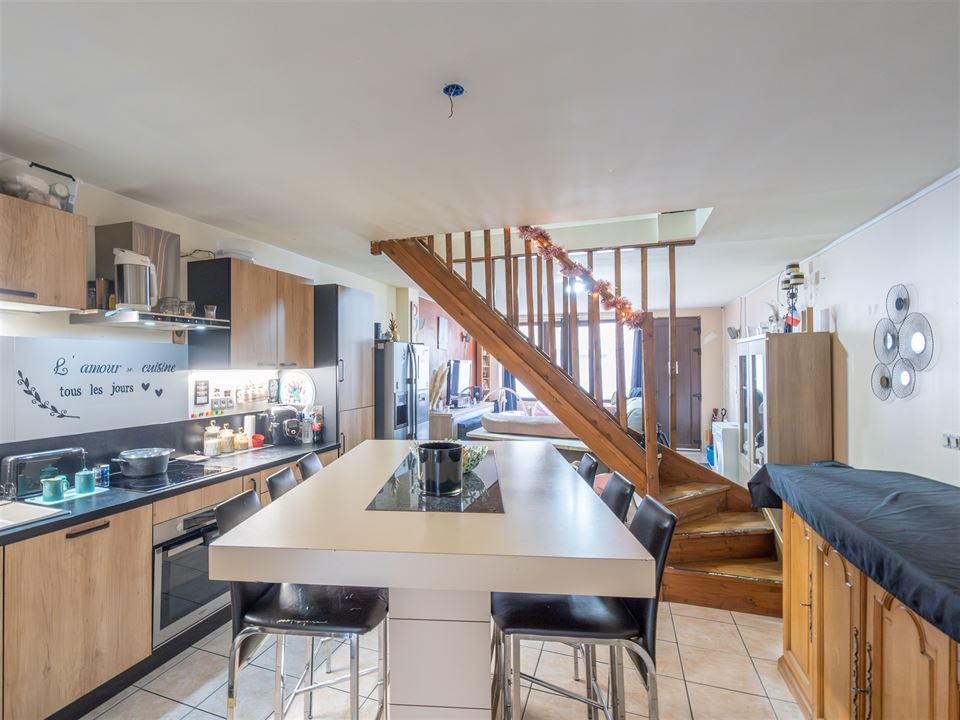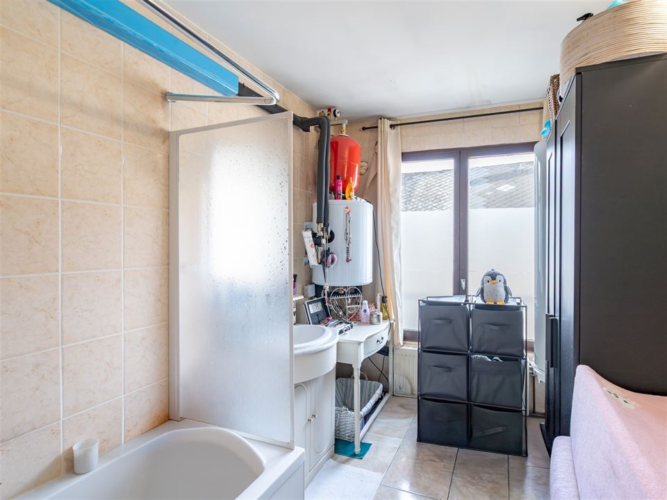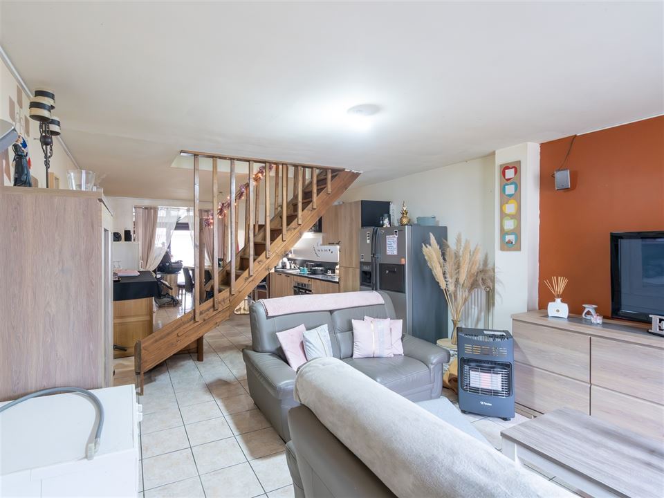 Dès l’entrée, l’espace de vie principal s’ouvre harmonieusement et comprend un salon convivial, une salle à manger ainsi qu’une cuisine équipée fonctionnelle. Une véranda prolonge agréablement l’espace et offre un accès direct vers la cour extérieure. Une buanderie/arrière-cuisine ainsi qu’un WC indépendant complètent le rez-de-chaussée.