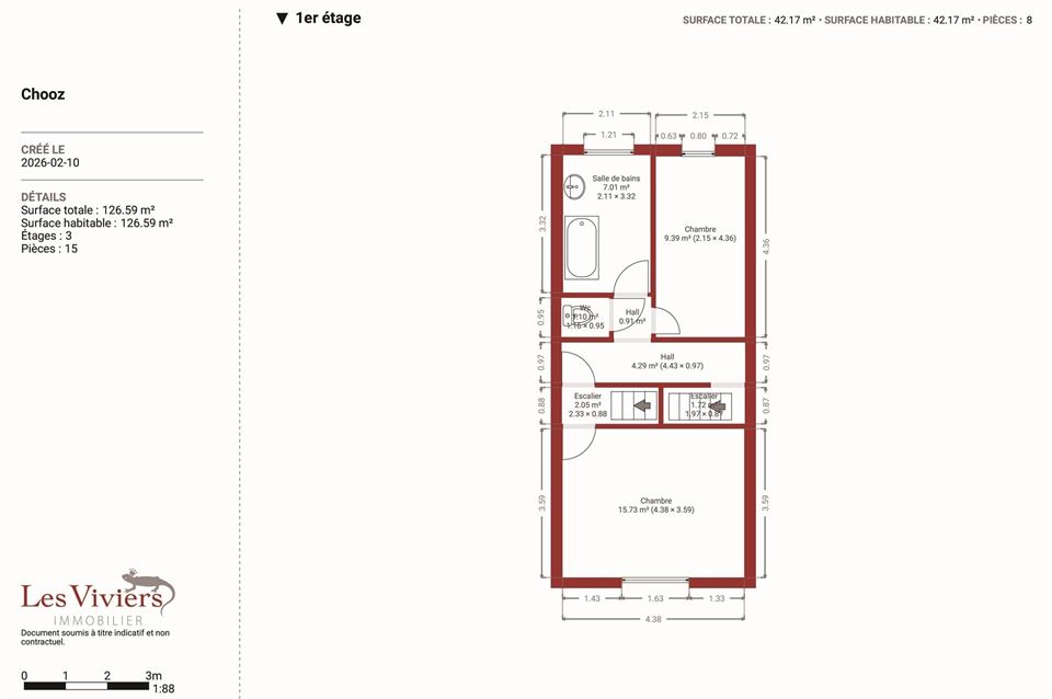 Le premier étage se compose d’un hall de nuit, d’un WC séparé, de deux chambres confortables ainsi que d’une salle de bains équipée d’une baignoire. Le second étage propose deux chambres supplémentaires, idéales pour une famille. Un grenier de stockage vient parfaire l’ensemble.