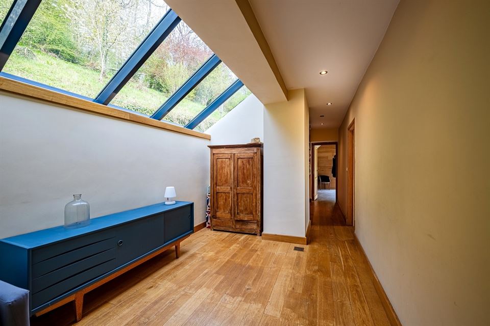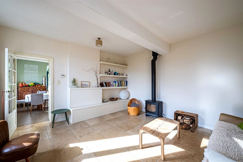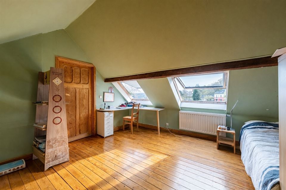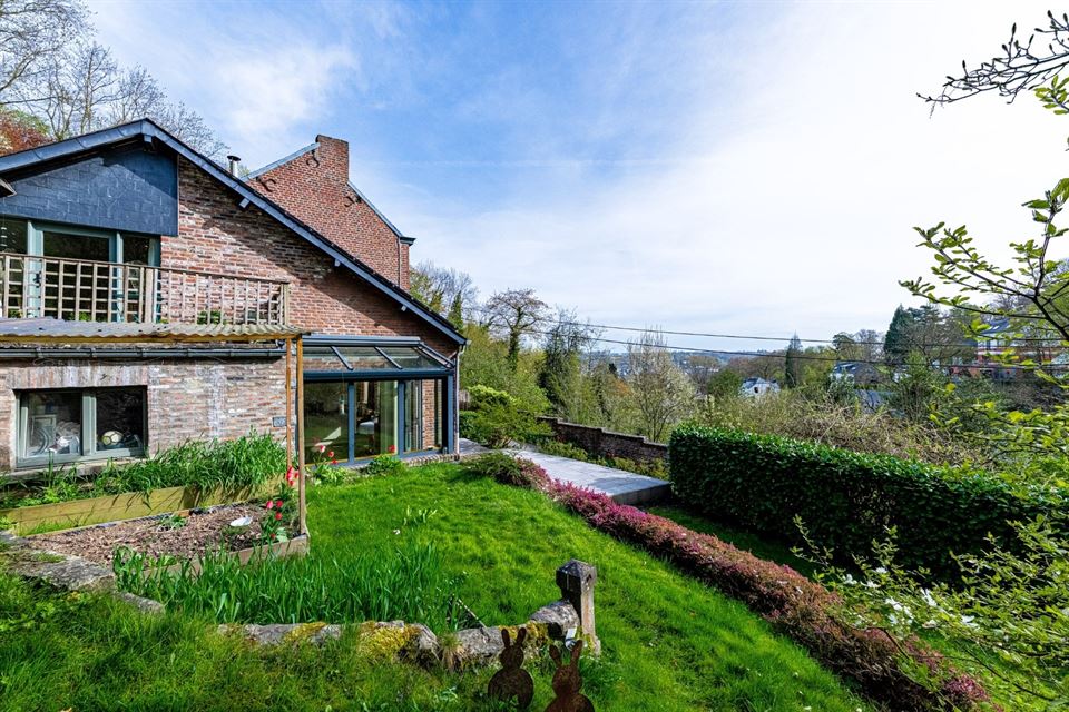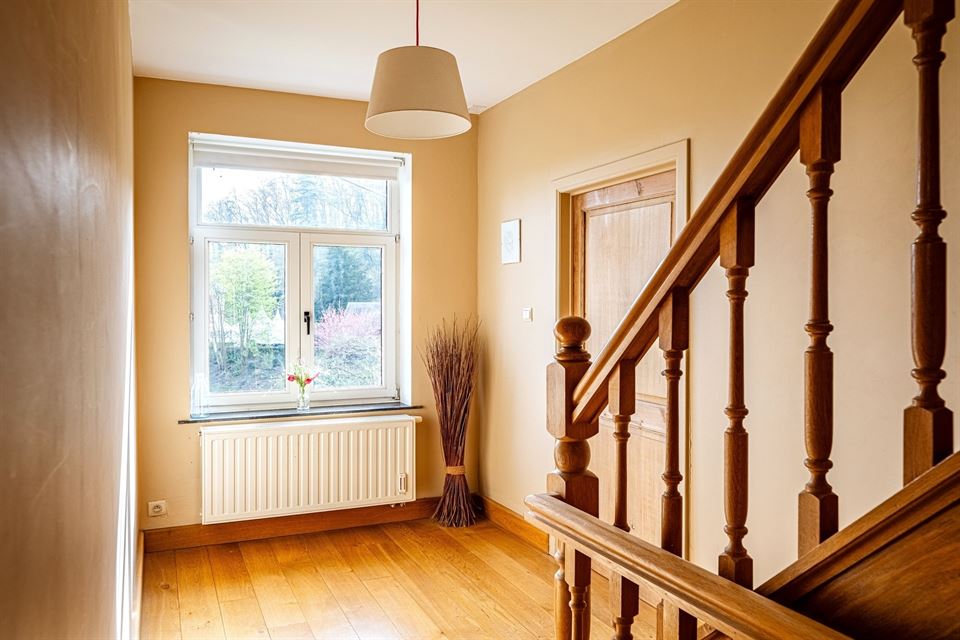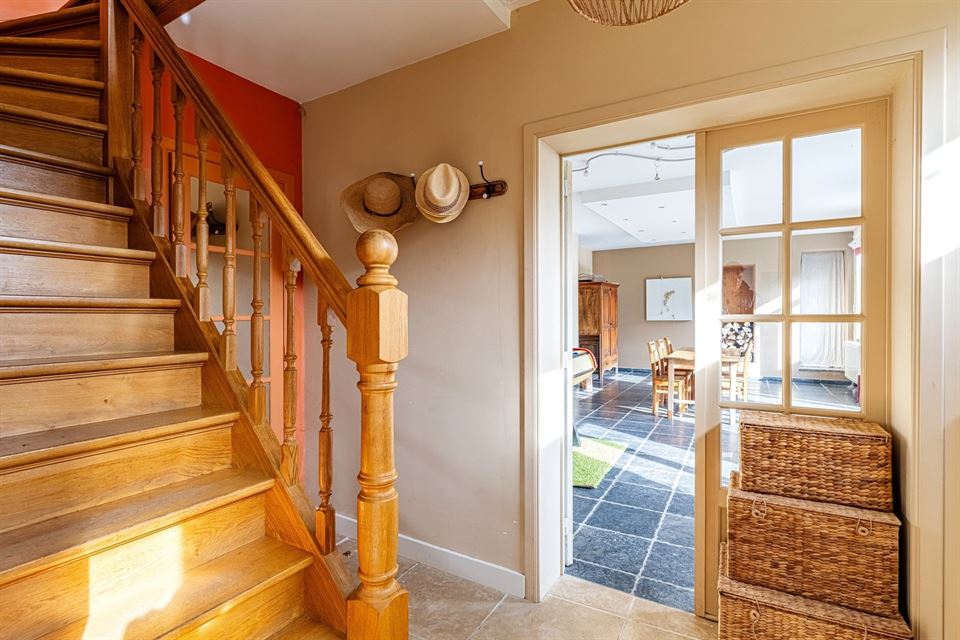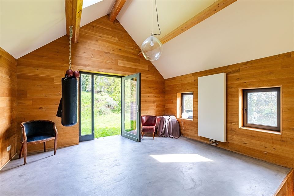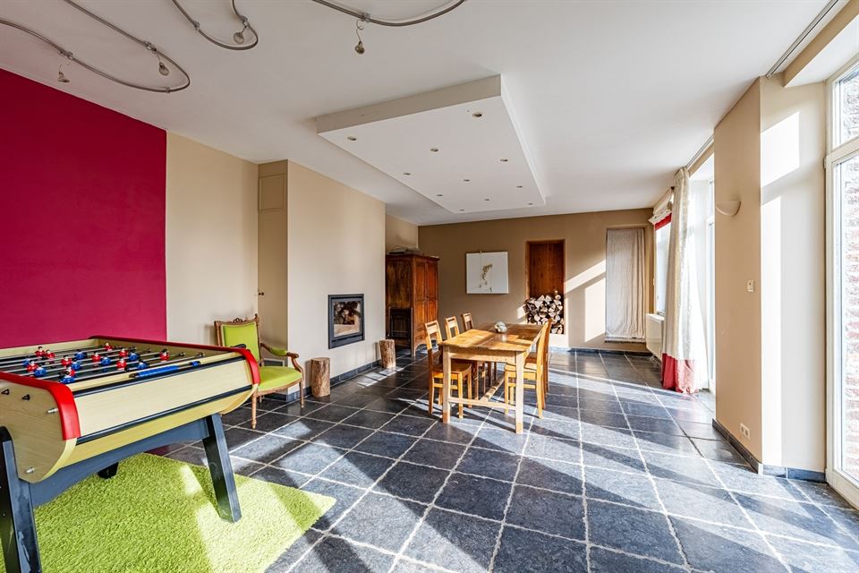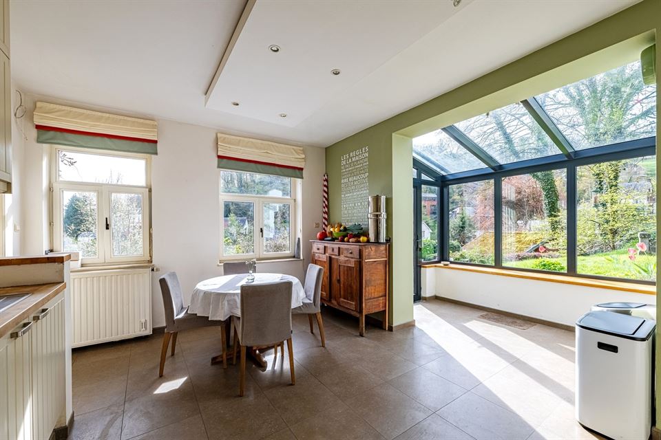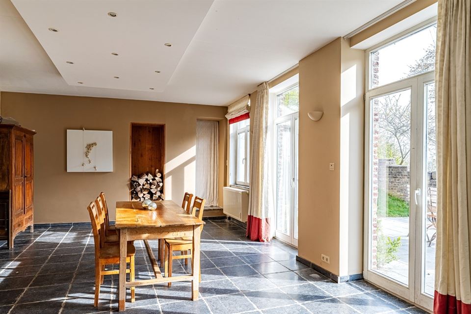 L'intérieur dispose de beaux volumes et se compose comme suit : hall avec wc, spacieux séjour (salon/sàm) avec poêle et K7 à bois, cuisine équipée (avec arrière-cuisine et buanderie), une suite parentale avec salle de bains privative, 4 chambres, 1 pièce polyvalente ouverte sur le jardin (chambre, jardin d'été, bureau, ...), une salle de bains, un hall de nuit avec espace sous verrière (idéal pour l'aménagement d'un bureau). Grenier, caves, garage fermé et emplacements de parking. La propriété dispose également d'un espace indépendant d'environ 40 m², accessible via une entrée latérale avec terrasse privative. Cet espace convient parfaitement à l'exercice d'une profession libérale ou d’un logement airbnb.