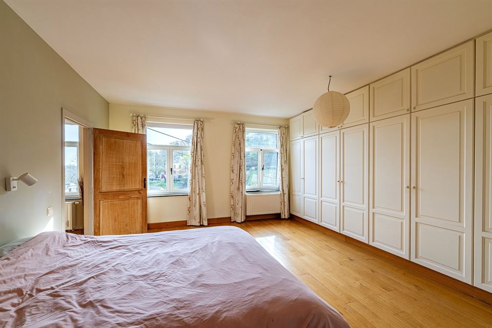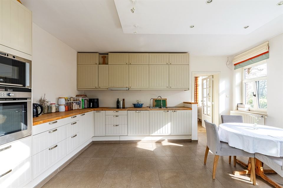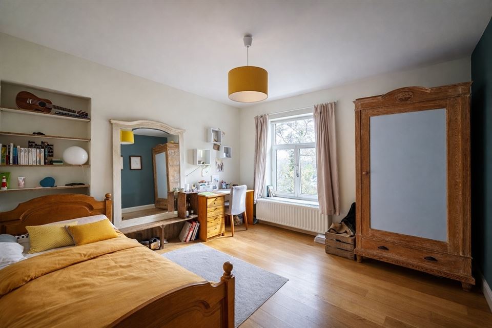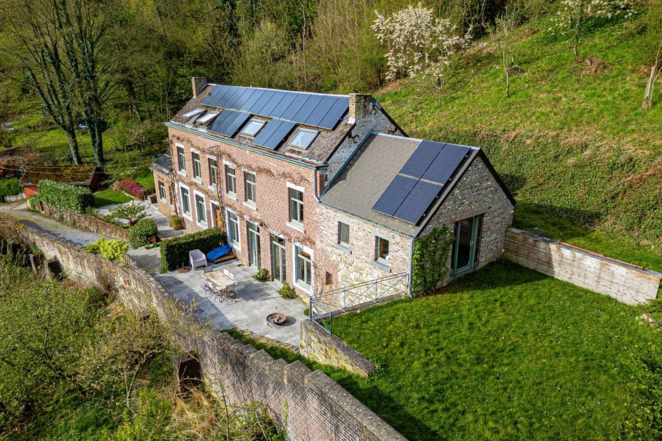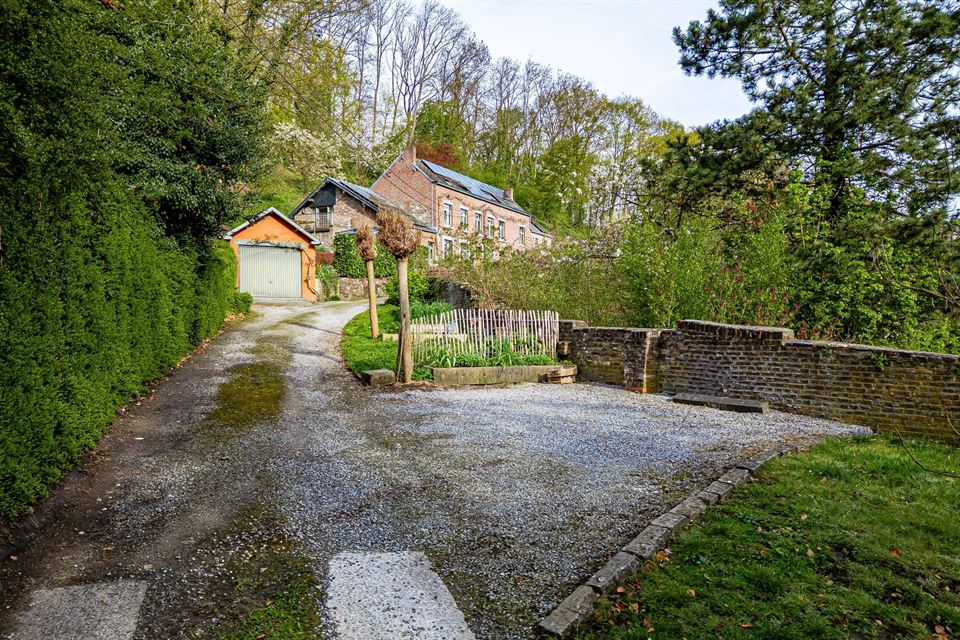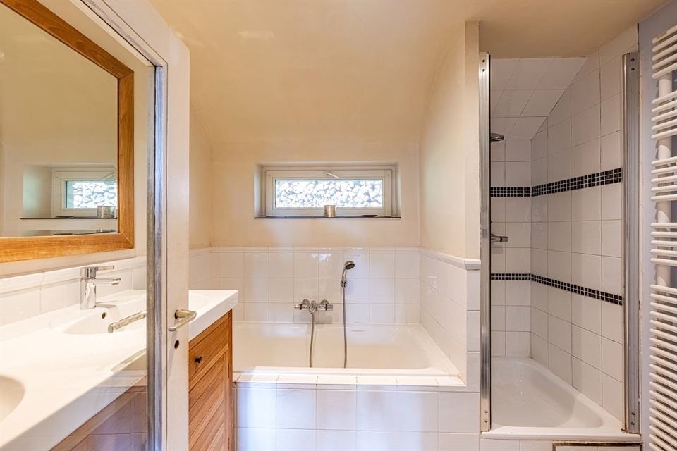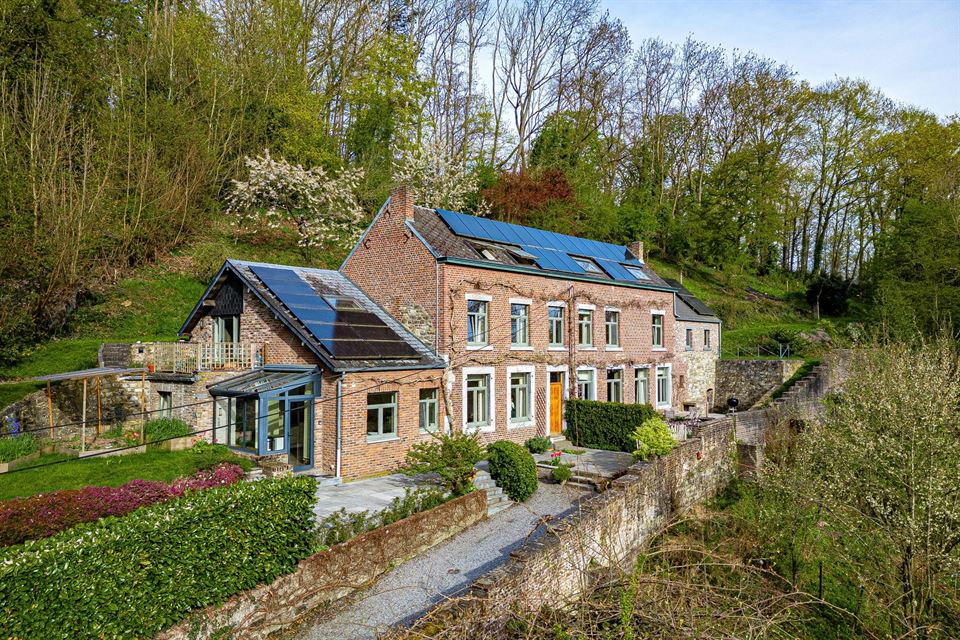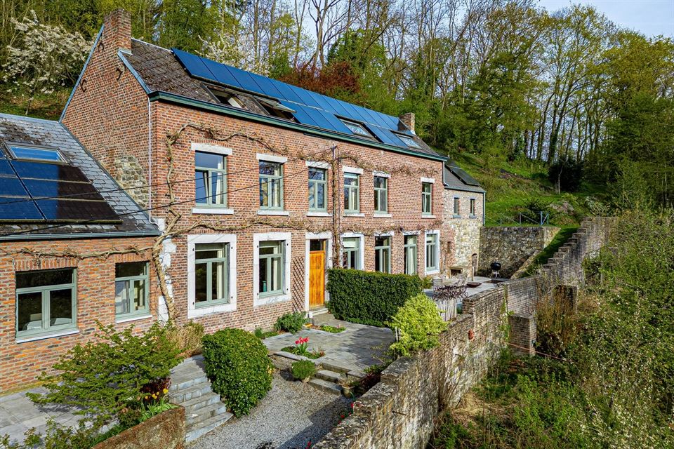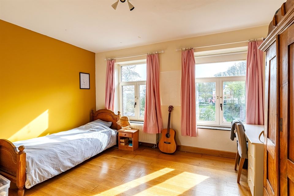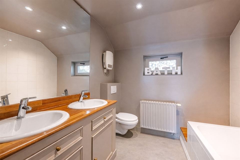 L'intérieur dispose de beaux volumes et se compose comme suit : hall avec wc, spacieux séjour (salon/sàm) avec poêle et K7 à bois, cuisine équipée (avec arrière-cuisine et buanderie), une suite parentale avec salle de bains privative, 4 chambres, 1 pièce polyvalente ouverte sur le jardin (chambre, jardin d'été, bureau, ...), une salle de bains, un hall de nuit avec espace sous verrière (idéal pour l'aménagement d'un bureau). Grenier, caves, garage fermé et emplacements de parking. La propriété dispose également d'un espace indépendant d'environ 40 m², accessible via une entrée latérale avec terrasse privative. Cet espace convient parfaitement à l'exercice d'une profession libérale ou d’un logement airbnb.