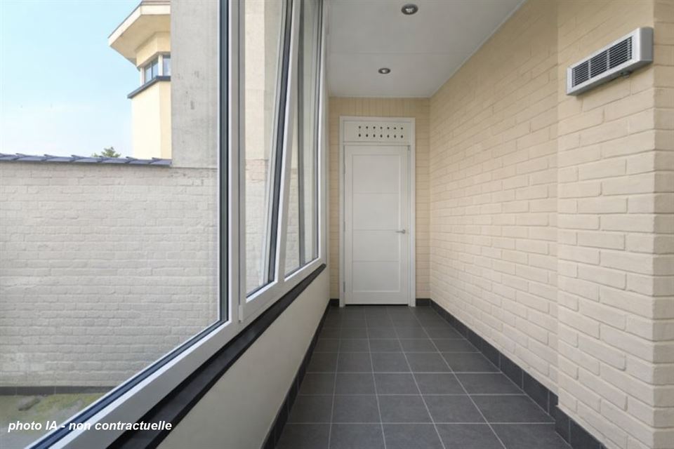 Un hall d'entrée avec vestiaire et porte blindée, menant à un beau séjour lumineux avec parquet, offrant un espace de vie agréable et chaleureux. La cuisine équipée s'ouvre sur une terrasse fermée. Le hall de nuit dessert deux chambres avec parquet, ainsi qu'une salle de bain avec WC.